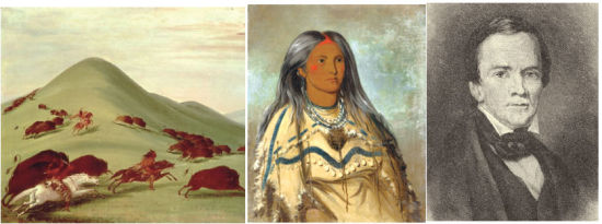 喬治·卡特林1796年生在賓夕法尼亞州的一個白人家庭。25歲,他放棄了地方資產者倚重的律師生財之道,離開妻子和兒女,全身心投入為印第安 人畫像的事業。他深入“平原印第安人”的各個“紅皮膚”種族部落寫生,短短幾年,畫就了500多幅印第安人肖像及生活圖景。他揮筆實地寫生,展現美洲原住 民隨著白人大肆屠殺野牛而失去主要生活依靠的困境??ㄌ亓值淖髌凡⒎菃渭兊拿佬g,考慮的是從人種生態學角度反映白人殖民者的貪婪給整個印第安民族造成的生 存危機,與美國好萊塢“西部片”里一味將印第安部落歪曲成野蠻殺害白人的元兇截然不同。而且,卡特林跟印第安人同吃住,穿戴他們的服飾,幾乎成了土著部族 的一員。除了繪畫,他全面關注印第安人的文化藝術,收集他們的雕塑和刺繡等手工藝品,于1838年建立了“印第安藝術館”。