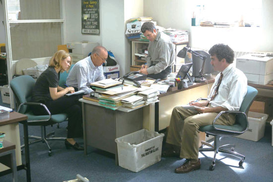 難得的是,在“反派”幾乎無所作為的情形下,《聚焦》將情節張力保持到了最后一分鐘,你大約也能猜到,報道刊出當日報社的電話會被打爆,但是在 四位記者走進報社時,電影還是成功地調動了你期待的情緒。這種張力,一方面很大程度上來自于難度層層升級的情節模式——從調查一名神父到證明整個體系出了 問題,另一方面影片還設有一個小懸疑: