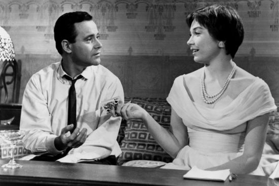 這是棋子和玩物、被侮辱與被損害者的愛情。然而,比起《熱情如火》,這兩個角色顯然得到了更多的真情實感。庫布里克的“簽名”是浴室,每部電影 里都有一幕發生在浴室,而懷爾德的“簽名”是“牌桌”,幾乎每部電影都有人在打牌。懷爾德認為,他最早受到的人性教育是在臺球室,在那兒他看慣了賭局, “關于人性我學到了很多,沒有一樣是值得贊許的”。這樣認識這個世界的他,難怪會執著地喜歡以騙局構筑故事?!度章浯蟮馈防锿媾频氖恰跋炏瘛眰?,《熱情如 火》里則是黑幫,而《桃色公寓》以一個玩牌的場景結束。那是只屬于巴克斯特和弗蘭兩個人的牌局。