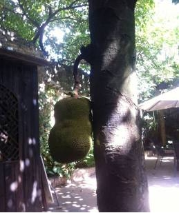 中山路自在咖啡的后院,像是紅塵之外的清涼之地,戲樓、老墻、舊門、草簾子、泡菜壇子和綠樹古藤相映成景,仿佛時光在這里停滯了,邀請紅塵中忙碌的人們坐下來歇腳。采風團的作家們剛剛坐定,又被一棵菠蘿蜜樹搶奪了眼球,樹中間長出了一顆碩大的菠蘿蜜果,據說還是處女果。佛教《心經》中的第一句經就是:“觀自在菩薩行深般若菠蘿蜜多時,照見五蘊皆空?!倍@經的全稱又叫《般若菠蘿蜜多心經》。菠蘿蜜樹長在???,又結出碩大的果實,這證明此地的福報很大,是圣地。