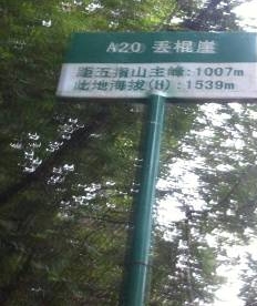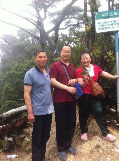 接近12點的時候,我們終于爬上了五指山的一峰,山上并沒有廟,只是一小塊平地,散亂著礦泉水瓶等垃圾,靠山路的一側是一棵發黑的枯樹干,樹干橫倒著,估計是雷擊所致。祁將軍、孫玉民和我在指示牌下拍照留影,我手里舉著沿路採來的樹枝,滿臉開心自豪的笑著。這里是A27五指山一峰,海拔1839M,距五指山主峰二指還有370M。