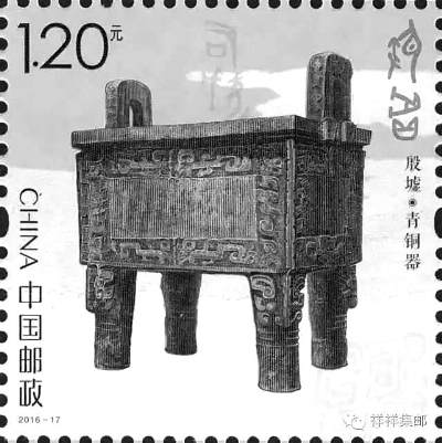 7月13日,中國郵政發行《殷墟》特種郵票,其中第二枚“青銅器”的圖案是國家博物館的鎮館之寶——司母戊鼎,現稱“后母戊鼎”。這是迄今世界上發現的最大、最重的青銅器,也是河南安陽殷墟獨特的符號。此前后母戊鼎已經兩次繪入我國郵票。1964年8月25日,我國發行一套《殷代銅器》特種郵票,其中第八枚為“司母戊鼎”;2012年7月8日,我國發行一套《國家博物館》特種郵票,其中第二枚“館藏文物——鼎”,圖案以“票中票”的形式再現了《殷代銅器》特種郵票中的“司母戊鼎”。