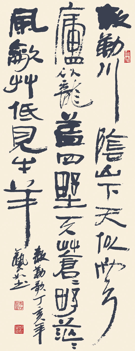 蒙古文書法是一個比較年輕的藝術形式。蒙古文書法的書寫在執筆和運筆方式上都與漢語書法有密切的關聯,同時形成了自己獨特的運筆方法。藝如樂圖的蒙古文書法創作,更多受到了秦漢簡牘和章草的影響。他對字尾、尤其是挑畫和捺畫的處理,粗獷而有力度,令字體有一種向前的推力和飛動感。而在字符較多的書寫中,尾部的筆畫粗細、虛實變化,剛柔適度,錯落而有序,使字與字之間或行與行之間,形成穩固而彼此呼應的整體。這一特點在他的“成吉思汗箴言”等幾幅蒙古文書法作品中尤其明顯。他的一幅蒙古文條幅,中間為大字的“平安”,濃枯并行,字體峭立而渾厚。而左側的四行朱砂小字,與右邊的上中下三枚印章遙相呼應,幾近完美。他善于利用大字與小字的結合與映襯,將文人畫的構圖與書法的空間構成巧妙地契合。他的《達·那楚克道爾吉詩一首》更是令人叫絕,小字如影隨形,大字氣勢磅礴,整體又如大汗引領千軍萬馬?!安屎纭眲t完全用枯墨寫就,蒙古文字特有的象形結構,使其有一種君臨天下、百花肅殺的威武和滄桑。這種氣魄與格局,即使在漢語書法中也不易見到。