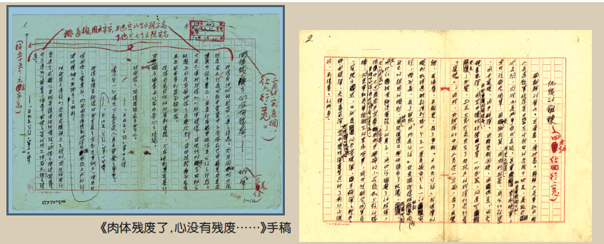 胡風參加作家訪問組是帶著任務去的,返回北京不久,7月4日,《人民文學》副主編嚴文井即發來催稿信,催促胡風趕緊寫反映志愿軍歸國戰俘情況的作品,這應該是胡風從北京出發前就與《人民文學》約好的。因為按照有關指示,1953年下半年,《人民文學》集中發表了一系列以抗美援朝為題材的文學作品,包括路翎的一批代表性的作品,也多是在這半年內相繼發表的。7月8日,胡風開始寫《肉體殘廢了,心沒有殘廢……》一文,這一段時間,胡風在北京的新住所剛剛安定下來,正在整理新房子,所以寫作也是時斷時續。斷斷續續地寫了幾天后,7月17日,胡風寫完了這篇作品,送《人民文學》編輯部審查。審查通過之后,胡風根據各方意見,分別在8月14日、25日修改、??戳艘淮?,完成定稿。