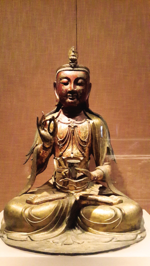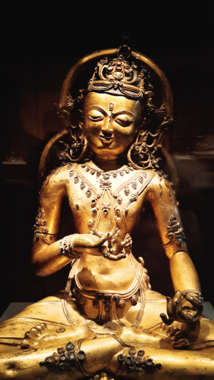 首都博物館藏銅鍍金金剛薩埵菩薩像(元)帶項圈和長瓔珞,并鑲嵌綠松石。