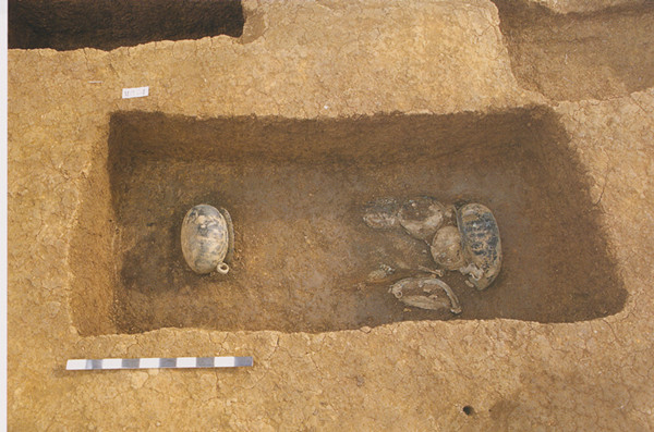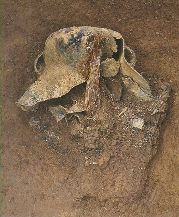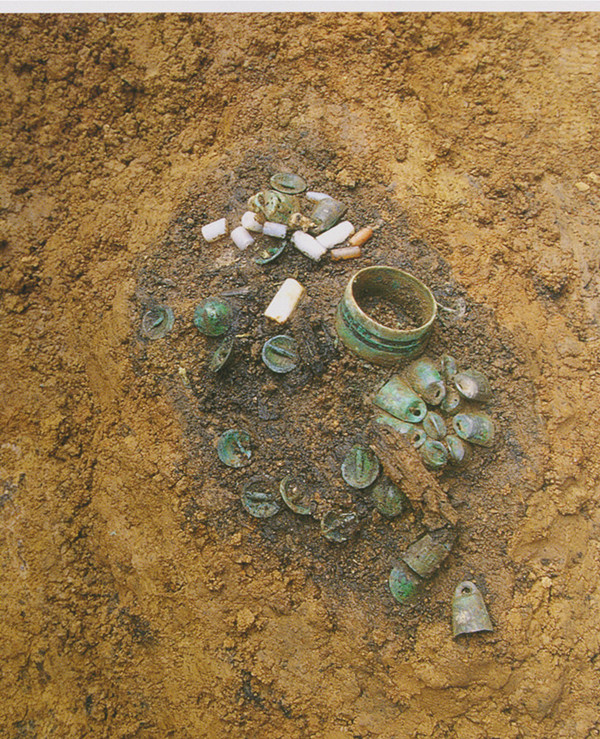 第二天一早,興奮了一夜的隊員們再次來到出土這些奇形怪狀器物的祖家老包小土丘上,在朝陽的映襯下,那黃色的土地顯得異常的親切,仿佛它們已等了兩千年,今天終于等來了破解這塊黃土地下掩埋著的神奇密碼的考古隊。在祖家老包附近不同的土丘上,隨著犁鏵的條條犁痕,一座座土坑墓的墓邊和里面夾雜著大量紅燒土顆粒的墓葬填土異常醒目,不用說,這是一處與此前發掘的漢墓不同的青銅時代墓地??脊抨犚膊患敝贞牷刭F陽了,將正在發掘的漢墓清理完后,迅即轉戰祖家老包,當年即清理了25座夜郎時期不同于漢墓的地方土著民族墓葬,發現了非常奇特的“套頭葬”和一批獨具地域特色的青銅器,包括容器、兵器和裝飾器等,真正揭開了貴州夜郎考古的序幕。