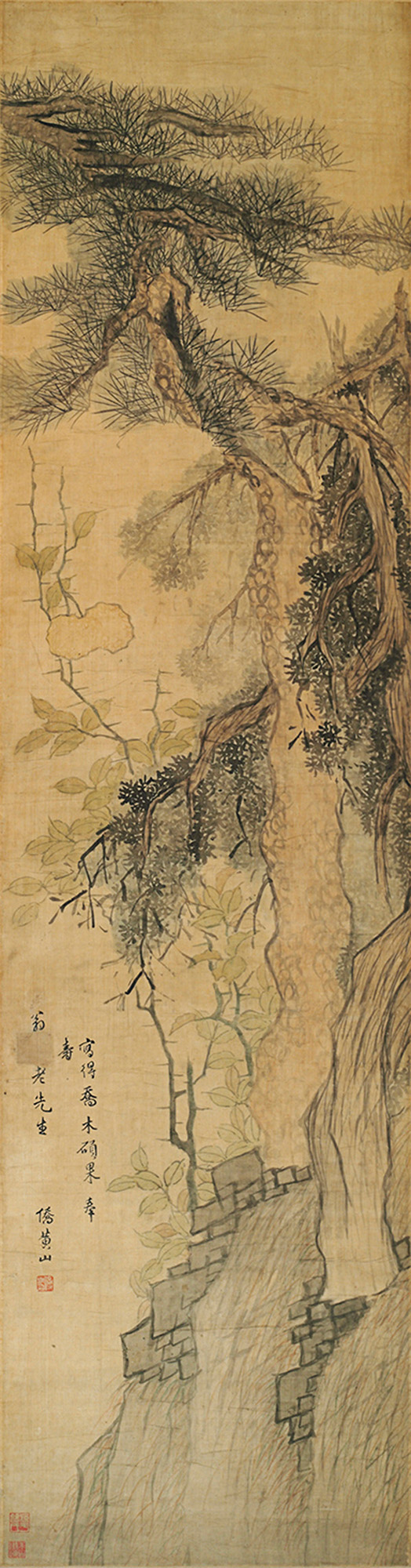 傅山最初如何習畫,師承何人,今已不得其詳。但傅山對書畫方面的天賦和造詣早年就顯現出來,在他二十六歲時曾被收藏家黃雙鳳請為所藏宋元書畫鑒賞。另載傅山曾與回族畫家梁檀相交篤甚,時常前往請教,并撰有傳記。從現存梁檀書畫看,傅山與其有一定的淵源關系。傅山繪畫作品現存不多,皆以山水、松石、花卉、禽鳥等見長,屬文人逸格一派,且風格多樣,博采眾長,或取徑院體,或法元人寫意,或賦彩整密,或醉墨淋漓……,不落古人窠臼,主在性情及認知的表達,以氣骨勝,《畫征錄》載有:“傅青主畫山水,皴擦不多,丘壑磊珂,以骨勝,墨竹也有氣”。從傅山《題自畫老柏》詩可知揮毫潑墨概發于意者:“老心無所住,丹青莽蕭瑟……擲筆蕩空胸,怒者不可見。笑觀身外物,消遣又幾日?!?/p>