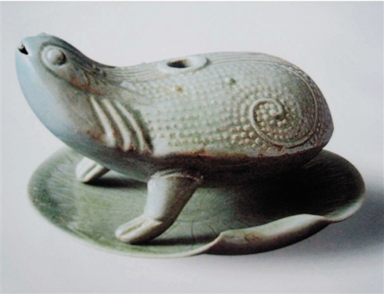 越窯肈始于商周,青瓷成熟于東漢,源遠而流長。逮至晚唐、五代及北宋初,以慈溪上林湖為中心的越窯,燒制的青瓷器已達到爐火純青、登峰造極的頂峰,被列為中國瓷窯之首。尤其是吳越國時燒造的“秘色瓷”,更屬聞名遐邇的高檔宮廷珍品。依此件蟾滴造型和釉色特點顯為北宋早期孑遺,且具有“秘色瓷”遺風,恰為晚唐詩人徐夤盛贊越窯青瓷“竅剜明月染春水,輕旋薄冰盛綠云”的生動寫照。其匠心獨具的造型,玲瓏典雅的神態,深奧奇特的寓意,令人遐思,玩味無窮。