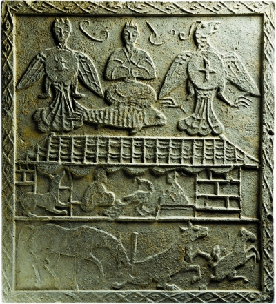 伏羲、女媧形象在漢代畫像磚里出現最多。在中國古代神話里,伏羲、女媧是人類的始祖,二者位列三皇。傳說伏羲創八卦、結繩造字,女媧煉石補天、捏黃土造人。他們成婚繁衍了人類,被譽為中華民族的“人祖”。女媧是有司生育繁子神力的女神,伏羲“制嫁娶”,亦含有司婚姻的意義?!胺伺畫z雙龍樓闕”畫像磚分上下兩部分,上為一座雙闕式建筑,左有一執笏官員,躬身迎接,闕內一人跪拜;右為伏羲女媧二神,其尾相繞,后延至磚的下部,呈一對巨龍,構圖巧妙。此圖應是虔誠婦人在官祠里向二神禱告,祈求幸福的婚嫁和綿長的子嗣。整個畫面渾然一體,充滿神秘,含義頗深。