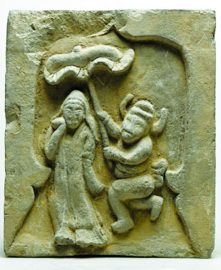 宋代“持荷”畫像磚里反映的是七夕之時,年輕男子持荷作傘為女子遮陽避雨。據文獻記載,北宋都城汴梁有七夕前后折荷花、荷葉的習俗:“七夕前三五日,車馬盈市,羅綺滿街,旋折未開荷花……又少兒須買新荷葉執之,蓋效顰磨喝樂?!边@種蘊藏著生活情趣的場景在宋金畫像磚里比比皆是,而文人式的婉約細膩的現實主義韻致也在畫像磚中體現得淋漓盡致。
