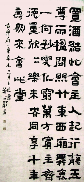 鄭簠素來作書精勤,態度認真,其弟子張在辛于《隸法瑣言》中言:“先生作字正襟危坐,肅然以恭,執筆在手,不敢輕下,下筆遲遲,敬慎為之?!倍@幅藏于上海劉海粟美術館的鄭簠書法軸內容為晉傅玄所作《前有一樽酒行》,原詩為:“置酒結此會,主人起行觴。玉樽兩楹間,絲理東西廂。舞袖一何妙,變化窮萬方。賓主齊德量,欣欣樂未央。同享千年壽,朋來會此堂?!倍娭小敖z理”被鄭書為“絲竹”,不知是版本之訛還是筆誤,俟考。然此并無礙這件作品的妙處,其妙處有三:一是作品中體現出的新理異態。于鄭之前,隸書的用筆平直古板、結體整齊均勻,而這幅作品用筆有輕重的主次變化,融入草書的疏勁筆意。如“絲”“萬”等筆畫的牽絲連帶以及尾筆飛白的舞動,皆有草意。二是作品章法上字距寬疏、行距緊密的布局規律,氣息面貌富有書卷氣息,此常被唐以后多數寫隸書者所忽視,而這也是令他成為清代碑學運動先聲的原因之一。三是這件作品于“三月上巳”所書,以此詩記,可想當日他與友人流杯曲水飲宴之狀,頗有書外情境。