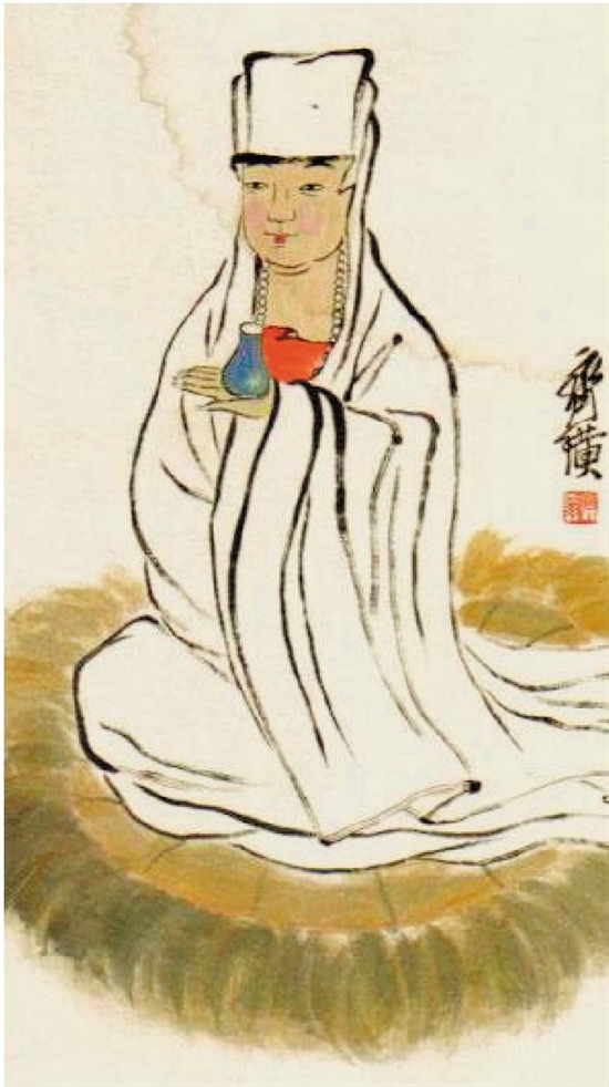 克隆拍品一,齊白石《觀音》(135×50cm,設色紙本立軸),成交價64萬元。該拍品明顯克隆抄襲自北京畫院藏齊白石《白衣大士圖》,真跡尺幅109×30cm,乃齊白石上世紀30年代所繪。真跡繪一白衣大士手托凈瓶盤地而坐,人物神態安詳,用線一氣呵成,設色濃而不俗,整件作品體現了齊白石“簡括而不草率”的人物畫特征。反觀克隆之作,用線輕浮無力,設色淡而不正,人物毫無神采可言,筆墨的疾澀、濃淡、飛白處理效果也大為遜色(如蒲團的用筆),題款鈐印完全照搬,但盡露亦步亦趨之態。最明顯的是偽作將人物畫在正中,十分呆板,與齊白石真跡將白衣大士巧妙安排在畫面左側,人物重心的移動使畫面富于變化相比大相徑庭。
