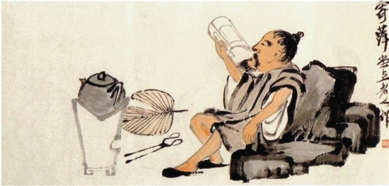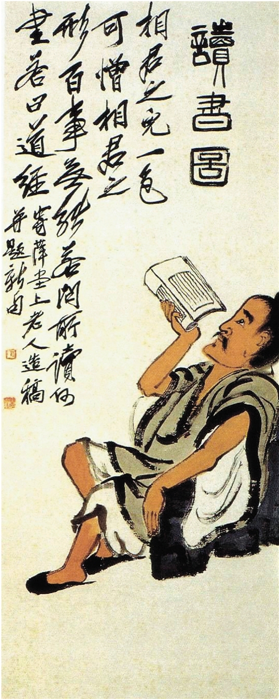 1899年,齊白石投師王湘綺門下,廣交文人,“五出五歸”,思想上發生巨大變化,開始刻意追求文人畫的筆墨意趣。1919年定居北京后,他著手“衰年變法”,此時工細人物減少,粗筆大寫意一躍而成基本格式,不少作品皆源自切身的生活體驗。上世紀三四十年代,是齊白石繪畫藝術的盛期,個性風格完全形成,題材、形式趨于穩定,這一時期的人物畫筆簡而意足,縱筆揮寫,畫中充滿幽默、智慧和諷刺,如《鐘馗搔背圖》、《讀書圖》、《升官圖》、《不倒翁》等,不少作品還題有自作詩和大段的題跋,以詩畫結合的方式直率地表達了對社會人世的看法,徹底擺脫了此前他的人物畫中的工匠氣,是他晚年人物畫的一大特征。