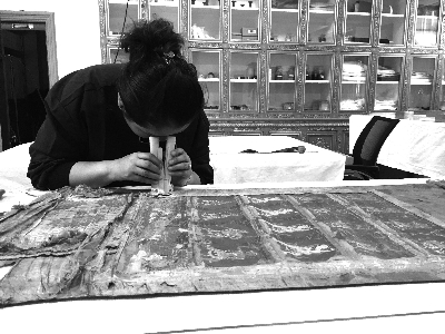 京紅正在仔細觀察唐卡破損的部位