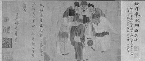 上海博物館日前在“吳湖帆書畫鑒藏特展”中,展出一幅元代畫家錢選(款)紙本設色《蹴鞠圖》,頗為引人矚目。此原畫傳為南宋名家蘇漢臣所作,畫面設色淡雅,用線古拙,描繪的是宋太祖趙匡胤與其弟宋太宗(趙匡義)及開國功勛趙普、楚昭輔、黨進、石守信等玩蹴鞠時的場景。此事在《宋史》和宋代野史筆記中多有記載。