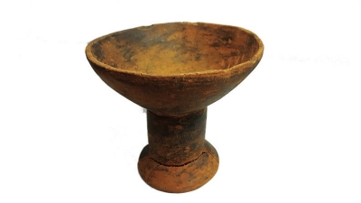 崗子遺址除有與東山頭遺址基本相同的大量夾砂陶片外,下暴雨沖出一件紅褐色陶豆的底口,略除周圍的泥土將其取出,是一個陶豆,豆盤為圓唇敞口,盤大腹深。經實測,豆盤口徑15厘米,通高14厘米、柱高6厘米、柱徑6厘米。還采集到3件柱形紐,有1件帶口沿,碎成3塊,但未分離,已拼對修復。另有1個夾砂灰陶完整器底,直徑13厘米,底厚1.8厘米,帶有一半器壁。陶片較多,見有鹿等動物骨殖,采集到4個黑陶豆把,有空心,也有實心,火候很高。此地疑為房址。在其附近,發現1個石臼。