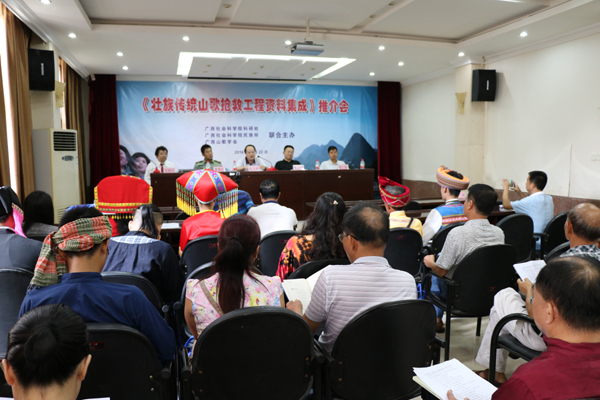 2016年8月22日,由廣西社會科學院科研處、廣西社會科學院民研所、廣西山歌學會聯合召開的《壯族傳統山歌搶救工程資料集成》推介會在南寧舉行。參加會議的有來自北京的《解放軍報》文化部副主任、主編曹慧民,中國大旗文化產業集團董事局主席顏建國,廣西社會科學院副院長黃天貴,廣西社科聯副巡視員何明,廣西社會科學院科研處長蔣斌等領導同志,以及廣西民族大學、廣西師范學院、廣西山歌學會、廣西壯歡學會等單位的領導、專家教授、歌王、歌手和廣西日報、南國早報、廣西民族報等媒體記者共40余人。會上,與會領導和專家教授對《壯族傳統山歌搶救工程資料集成》工作作了肯定的評價,并對民族傳統文化的繼承和發展問題發表自己的意見和建議。廣西社科院民研所楊昌雄副研究員代表課題組作《壯族傳統山歌搶救工程資料集成》調研報告。