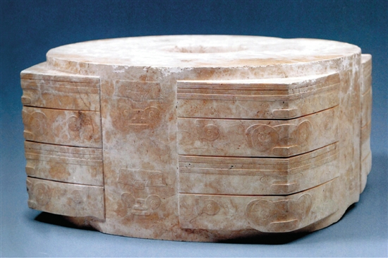 1986年浙江省杭州市余杭區瓶窯鎮反山遺址M12出土 該件玉琮重約6500克,形體寬闊碩大,紋飾獨特繁縟,為良渚文化玉琮之首,堪稱“琮王”。器型外圓內方,上大下小,中間對鉆圓孔。琮體四面直槽內上下各琢刻神人獸面圖像,整體圖案采用淺浮雕和線刻技法雕琢而成。在呈角尺形的長方形凸面上,每兩節琢刻一組象征性的神人獸面圖案,以轉角為中軸線向兩側展開,獸面的兩側還各淺浮雕一變形夸張的鳥紋。玉琮,是良渚文明特有的禮儀重器。它的工藝技術代表了5000年前玉器制作的最高水平;它所體現的用玉制度,揭示了禮儀制度的建立形成,對中國后世“禮制”文化的發展完善產生了深遠影響。特別是上面的神人獸面圖案,是具有共同信仰的原始宗教重要標志。