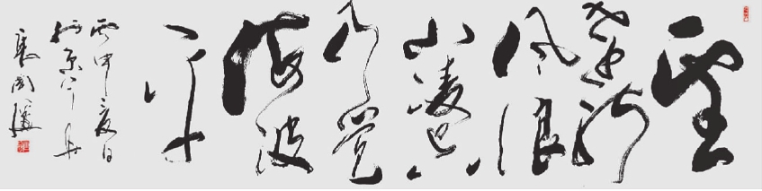 大陸演員唐國強主演的《三國演義》一度風靡海峽兩岸暨港澳地區,所刻畫的諸葛亮形象深入人心。他喜歡書法的事情在圈內眾人皆知,曾經有媒體報道,他參加影視劇攝制時,無論飾演毛澤東還是雍正皇帝,凡涉及寫字的場景都不用替身,提筆即寫,揮灑自如。從他本次送展的兩幅草書作品來看,兩個橫幅,特別是寫杜牧《山行》一幅,28個字,不多亦不少,輕重緩急拿捏極有分寸,觀者如入山林秋色,神清氣爽,心曠神怡。
