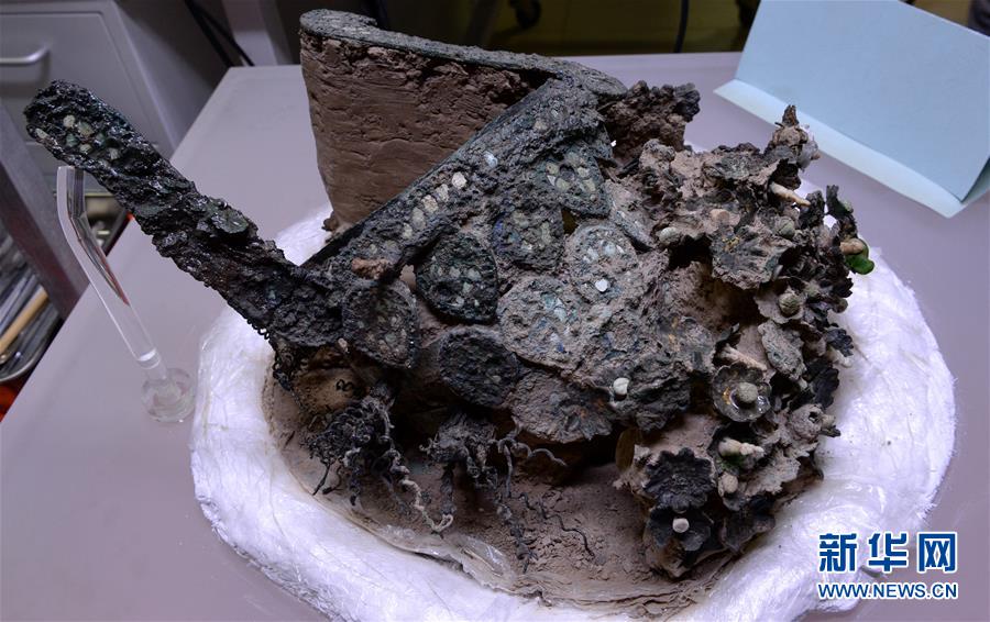這是在陜西省文物保護研究院拍攝的隋煬帝蕭后冠文物原件(9月5日攝)。 9月5日,陜西省文物保護研究院聯合揚州市文物考古研究所在西安發布揚州隋煬帝蕭后冠實驗室考古與保護成果,并公開蕭后冠仿制品實物??脊湃藛T現已確定蕭后冠框架由兩博鬢、呈十字交叉的2道梁和呈環帶的3道箍組成,還包括12塊水滴形飾、13棵花樹,冠主要采用銅、金、玻璃、漢白玉、珍珠等10種材料制成。 2013年3月,揚州市西湖鎮司徒村曹莊發現兩座磚室墓,后經專家確認為隋煬帝楊廣墓與蕭后墓。在蕭后墓出土的這件蕭后冠是目前國內考古發現等級最高、保存最完整的冠。 新華社記者 李一博 攝