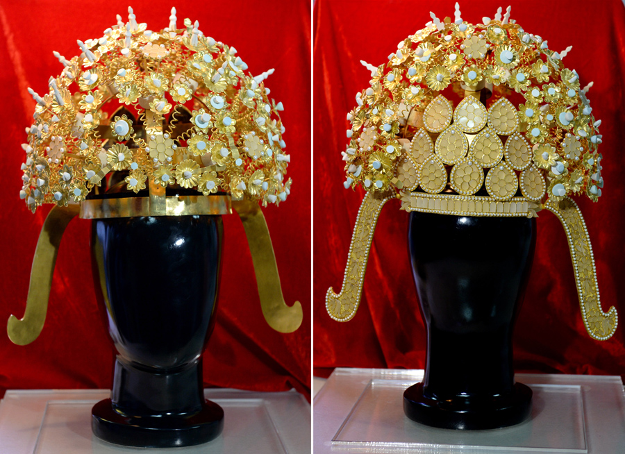 根據研究發現,蕭后冠的框架是由兩博鬢、呈十字交叉的兩道梁和呈環帶的三道箍組成。其上花樹13棵,花樹由花梗、花瓣和花蕊等構成,在冠后腦位置有12塊水滴形的飾件。經過深入分析,還明確了制作蕭后冠所用的銅、金、珍珠、棉、絲等主要材料,以及錘揲、掐絲、鑲嵌、珠化等飾件加工的十幾種工藝。