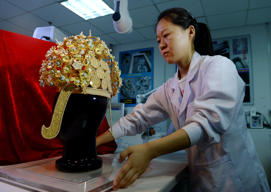 9月5日,文物保護工作者在陜西省文物保護研究院展示隋煬帝蕭后冠仿制品。(新華社記者李一博攝影報道 圖片來源:新華社客戶端)