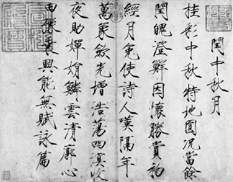 《閏中秋月帖》中所記為一首七言律詩:“桂彩中秋特地圓,況當余閏魄澄鮮。因懷勝賞初經月,免使詩人嘆隔年。萬象斂光增浩蕩,四溟收夜助嬋娟。鱗云清廓心田豫,乘興能無賦詠篇?!?/p>