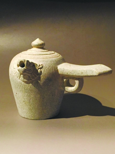 在鞠肖男收藏的茶器中,以唐宋居多,其中有一套唐朝的隨葬茶器是他最為看重的。唐代茶器存世很少,這套唐代孔雀石茶器的難得之處,不僅在于它十分完整精致,由茶臺、茶碾、水壺、煮茶器、茶壺和四個茶杯組成,真實地反映了當時人們飲茶的方式:先將制成的茶餅敲成小塊碾碎,將水壺中的水倒入煮茶器燒至將沸時倒入茶末,煮開之后倒入茶壺,再倒入茶杯。