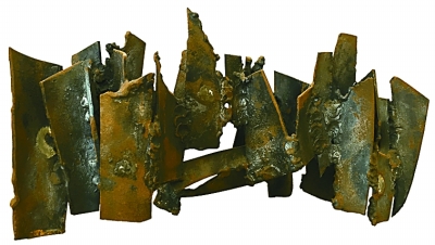 《筆架》這幅作品的材質仍然采用熊秉明先生自《嚎叫的狼》以來沿用的鐵片造型。圍繞“筆架”這一主題,他完全舍棄了雕塑的封閉性空間和巨大的立體式造型,轉向一種開放式的、更為簡單、純粹的表達。環形帶狀的鐵片相互錯落地搭架在一起,有直立的、有橫著的,高矮不一、參差有致,連焊接的印記也一并留存在作品之中,成為作品本身的一部分,從而使觀者能夠更加純粹地感受材質以及造型帶來的空間和美感。所以楊振寧先生說:“你不光看到他的鐵片,而且鐵片之間的空間也成為雕塑的一部分?!边@種將雕像原有的巨大實體消解在空間中,使空間也成為雕塑造型甚至審美的一部分,顯然是貫穿著熊秉明先生自身獨特的思考在其中的。而楊振寧先生能如此敏銳地感受到熊秉明先生的創作意圖,也正是他們七十余年的友情的最好見證。在藝術和科學之間,他們顯然有許多共識,在許多方面也都有相同的文化情懷。