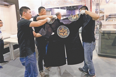 記者注意到,裝文物的木箱一打開,里面除了泡沫填充防震以外,還專門有結實的木條綁定關鍵部位,防止文物在箱體內晃動。木條本身也進行了布條或泡沫纏繞,以免刮碰傷及文物。開箱布展工作按照先置放大型的、具有獨立展柜的文物開始,比如鐘表、盒、座椅之類的重器。為了展陳效果,一些黑色的底部展布需要從雙層玻璃包裹的展柜里取出進行除塵處理,幾個工作人員特別用手持小型吸塵器精細地做著此項工作。
