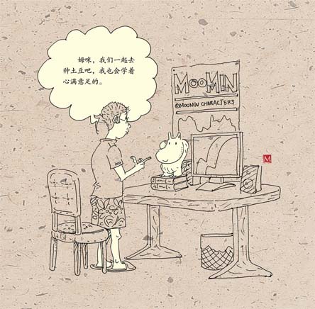 回國后,我查閱了一些資料,對MOONMIN有了更多的了解。托芙·楊松女士于1945年在瑞典出版了首部以MOONMIN為主角的圖書,書名叫《姆咪遇到大洪水》。此書出版后,很受讀者喜愛,于是托芙·楊松就一發不可收拾地寫啊寫,畫啊畫。到今天,以姆咪一家為主角的圖書已經成為讓全世界孩子著迷的經典讀物了,而姆咪這個形象更是深入人心。我敢保證,只要看上一眼,就會一輩子記住這個可愛至極的小胖子。相對于托芙·楊松的文字,我更喜歡她所創作的姆咪形象。無可質疑,楊松的故事和文字是世界級的,而她的繪畫和創造力則更勝一籌。放眼世界,可以找出很多非常優秀的兒童文學作家或畫家,但能像托芙·楊松這般把文學與繪畫都玩得如此精妙的,可以說目前是無出其右。有人曾問我,姆咪的形象到底好在哪兒?我的回答是:簡約和天真。