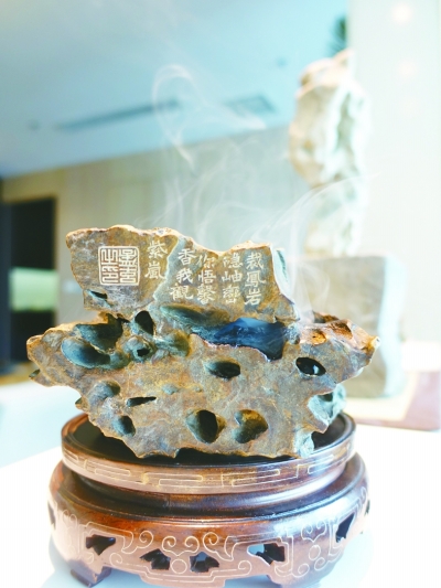 宋人趙希鵠的《洞天清祿》中記載:“東坡小有洞天石。石下作一座子,座中藏香爐,引數竅正對巖岫間,每焚香則煙云滿岫。今在豫章郡山谷家,其家珍重,常與告身同置一匣”(告身:委任官職的文憑)。蘇軾到底是名人,連他的玩,都被世人傳頌。這個名為“小有洞天”的觀賞石,經東坡居士獨出機杼的打造,把只有觀賞功能的供石,變成了有入鼻、入心功能的靈石香爐。玩觀賞石要配置相襯的底座,蘇軾將底座的內部空膛內藏香爐,同時,底座的表面上、緊貼觀賞石腳底的地方,開有若干小孔。這樣一來,暗藏于底座內的香爐一旦焚香起煙,便有煙絲從觀賞石腳底的各個孔竅中裊裊飄出,煙云滿岫。足不出戶,便賞山林之氣;坐擁禪室,頓感氣象萬千。