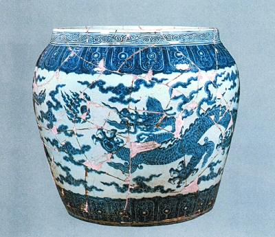 其一是清雍正年間內務府員外郎唐英制造的一件圣物。雍正八年(1729),唐英奉命在景德鎮御窯廠辦理窯務,他看到一件大型的明代“落選之損器”青龍缸被“棄置僧寺墻隅”。于是,他派遣兩人將這件損壞的青花龍紋大缸抬到一座祠堂旁邊,并修筑了一個高臺來安置它。這種古怪的行為引起了人們的困惑,唐英為此作《龍缸記》一文,回答他人的疑問。按照該文的解釋,這件破損的大缸是窯神童賓的化身。為了證明“神所憑依”,唐英對扭曲殘破的龍缸作精彩的描述與闡發: