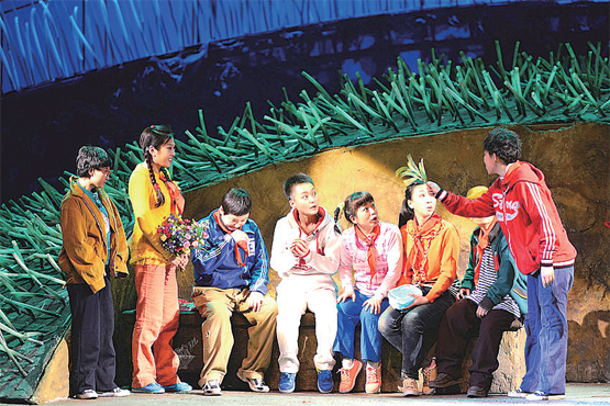 一、改變創作視角,由以成人的思維“站著”“教育”孩子,變為從孩子的視角“蹲下來”與他們“對話交流”?!督^對小孩》是一部真正讓孩子在舞臺上當“主角”的兒童劇。編導的高明之處不是“教育”孩子該怎么做,也沒有去指責孩子什么,而是以孩子的視角去思考問題,“平等地”與孩子“對話”,釋放他們的情緒,放飛他們的“夢想”,讓孩子們在生活的實踐中去觀察、去思考,去辨明是非,去校正自己的行為?!赌釥査跪T鵝歷險記》也是讓孩子自己教育自己,描寫尼爾斯從“離家”到“回家”,寫出一個孩子在成長過程中的情感變化?!丁跋麓伍_船”港》讓孩子在生活實踐中學會了判斷,改正了不珍惜時間、不愛學習的毛病?!段液臀业挠白印穼懶W生李大米因為學習成績不好而自卑,在自己“影子”的鼓勵下走向自強的故事?!洞笊嚼锏募t燈籠》描寫農村貧困孩子為了實現自己的理想之“夢”而刻苦努力學習的過程以及人格的成長,展現了孩子們的純潔心靈和遠大志向。