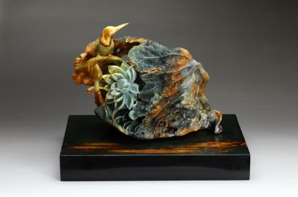翠鳴清荷這件藝術玉雕作品,是以花玉之奇特美麗的天然花色為靈感,青黃碩大的荷葉似在隨風而舞,炫彩的翠鳥望向風來的方向,似在聆聽遠方傳來的裊裊琴音,寓動態于靜態之中,帶來無限的遐想。作品巧妙運用了玉料豐富的色澤層次,遠觀如聞鳥啼,近看猶見水紋漣漪,風動荷擺,動情傳神。