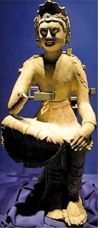 在故宮午門展廳中,還有一件青州龍興寺遺址出土北齊思惟菩薩像值得關注(圖4)。這尊菩薩像坐于藤椅之上,左腳下垂踏著蓮花,右腳搭在左腿膝蓋上,一副陷于沉思冥想的姿態。這種坐姿的菩薩被學界稱為思惟菩薩。菩薩上身裸露,下身著裙,胸飾也極為簡單。與前一件菩薩明顯不同的是,這件思惟菩薩的面部較為豐腴、圓潤,軀體也有粗細的起伏變化,顯示出印度笈多朝佛造像影響的因素。在佛傳故事中,有一個名為“樹下觀耕”的著名場景,講的是釋迦太子在樹下休息,看到農人耕地翻出土里的蟲子,旋即這些蟲子被鳥兒吃掉,頓生憐憫之心。這個故事在佛教美術中被不斷表現,主角多數作思惟姿勢。另外,思惟菩薩也可能是彌勒菩薩,除了有明確題記外,還與交腳彌勒相組合出現。思惟菩薩在北朝晚期的北齊至隋代造像中較為常見,曲陽白石造像中還能看到很多作對稱表現的雙身思惟菩薩。這種題材造像的流行,應該是與大乘佛教中菩薩行的救渡思想有關。