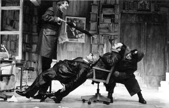 從純文學的角度上說,劇本分為可讀的和不可讀的??勺x的就是文學性很強,結構不一定嚴謹,比如契訶夫;而不可讀的,更多地是提供戲劇信息,主要為演出服務。達里奧·福很顯然是屬于后者,但這并不意味著其劇本缺少詩意。例如《他有兩把手槍,外帶黑白相間的眼睛一雙》故事源于一場帶有魔幻性質的分身術(真假喬萬尼),揭示一個在戰爭背景下的士兵(同時也是偷盜者)對戰爭及其國家機器支持者的抵觸。其中民間百態的天真、自然,有如萬花筒般回環往復地滑稽游離,但同時它也強有力地揭示了嚴肅的政治批判。作品開頭合唱道:今天被釘在高加索山上的普羅米修斯/仍像一頭山羊那樣懸在那里:/脾臟外露/嘴里含滿鮮花。/而這是對你罪有應得的懲罰。/……/我們從大腦中發現的任何反常的東西都可以通行。/但是,倘若大腦不接受它,那就會有非邏輯。/瘋狂、荒謬和病態產生。/……這一意象及其闡釋,可以作為達里奧·福的戲劇主線?!胺沁壿?、瘋狂、荒謬和病態”的戲劇正是他對世界中的“反?!薄安煌馔ㄐ小钡膽B度。