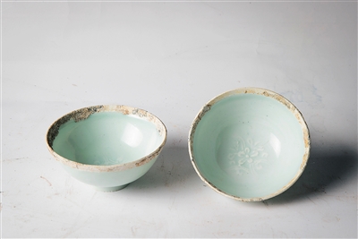 另外兩只南宋茶盞同樣也是出自湖田窯的影青瓷。制造者用模子在盞底印出凹凸的花紋,茶盞雖小,一只小小五瓣朵栩栩綻放,不難想象當年喝茶人端起這青白雅致的茶盞時心中的那份欣喜。碗口同樣也曾以銀鑲裹。丁英俊在杭州看到這兩只茶盞時也是立即收入。
