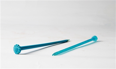 在7件捐贈藏品中,有兩支湖藍色的琉璃發簪很是搶眼。兩支發簪一支透明、一支不透;簪體表面光滑,呈釘狀;頂端作一圓形帽頂,作花飾狀。翻閱香港中文大學文物館出版的《中國古代玻璃》一書,我們看到了極為相似的幾款發簪。根據書中介紹,發簪是先制出簪身,固化后再加熱單模壓制花飾。