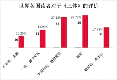 在作品風格和故事情節的分析中,有27.18%的人明確提到了“中國科幻小說”,有28.72%的讀者認為“很好”,17.95%的讀者認為《三體》是“最好的”“杰出的”小說,三項合計為73.85%,恰好印證了2萬多讀者給《三體》打出4分、5分的人數比例??梢姟爸袊苹谩毙≌f、“非西方風格”是《三體》贏得世界上這么多讀者青睞的主要原因。比如有個英國讀者寫到:“作為一個英語國家的讀者,我讀的大部分小說都是西方式的或者英語國家式的。這部小說讓我讀起來感覺很新鮮,人物不再是常見的美國式的、英國式的或者歐洲式的,也不是澳大利亞式的。讀劉慈欣的書,既是閱讀一部包含中國歷史文化的科幻小說,也是閱讀一部不以英語國家和說英語的人物為中心的小說?!庇忻绹x者寫道:“沒有讓我失望,與我讀過的科幻小說很不一樣,期待閱讀下一部?!薄拔液芟矚g這部小說,它充滿了令人驚喜的科學概念,此外小說中的觀點是非西方式的?!?/p>