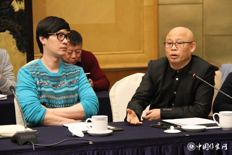 12月1日下午,北京代表團分組討論。圖為參會代表唐家三少(左)和張檸(右)。