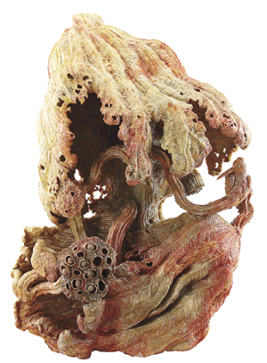 在中國文化藝術史上,在植物意象中花卉意象是比較豐富的。荷花是中國花卉畫的一個重要題材。我常年觀察荷花的過程中也逐漸喜歡并試著憑借二十多年來對壽山石色彩和雕刻技法的理解,在壽山石上表達自己獨特的荷花審美情感。荷花融入詩詞,融入音樂,亦融入繪畫。荷花既是佛門圣物,象征“出淤泥而不染” ,同時,它又是道教標識,充滿了珍祥色彩。而大儒周敦頤的《愛蓮說》 ,又賦予荷花高尚的人格魅力。在繪畫歷史上,八大山人、石濤、揚州八怪、吳昌碩、齊白石、張大千等都是畫荷花題材的大家,他們讓文人寫意畫成為花卉畫的主流。如果說,選擇蒼勁的秋荷作為展示我的這一審美情結的載體,是帶有幾分個人性情的藝術偏愛,那么,在每一件作品的布局謀篇和雕刻的精益求精上,竭力吸取歷代繪荷大師名作的神韻,從而力圖讓作品有一種天然的詩情畫意,則是自己苦心竭慮所追求的一大藝術意境。