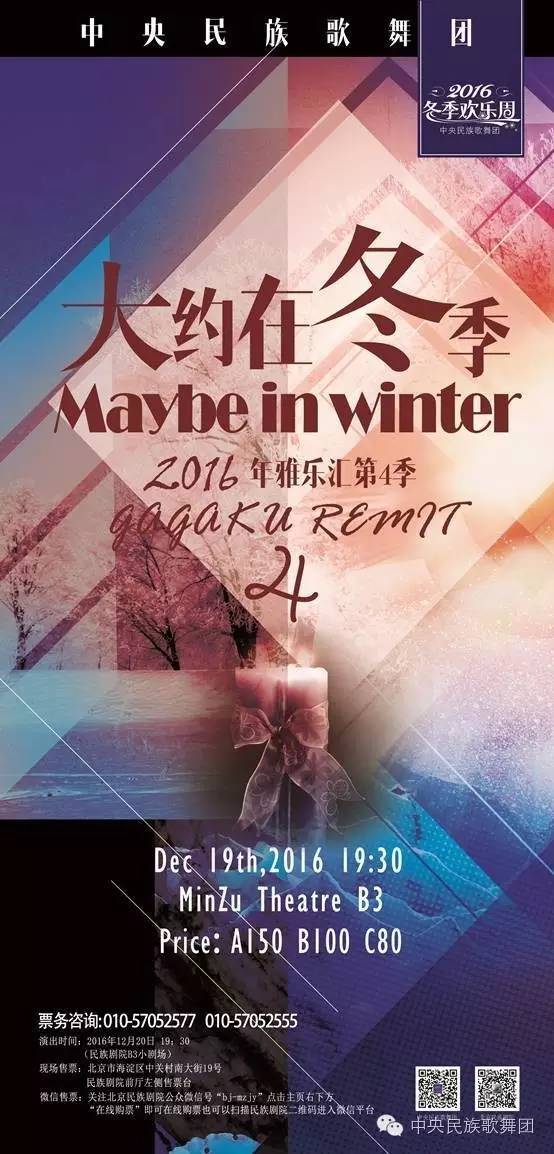 《2016年雅樂匯第四季—大約在冬季》將于12月19日在民族劇院B3小劇場帶來一場充滿溫情的音樂會,給觀眾帶來冬天音樂的別樣感受。