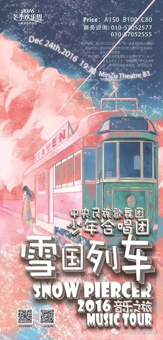 2016年度中央民族歌舞團少年合唱團的音樂會將于12月24日晚在民族劇院B3小劇場舉行,音樂會以“雪國列車”為主題,希望在平安夜的雪花中帶領觀眾一起搭乘雪國列車開啟一次音樂之旅。