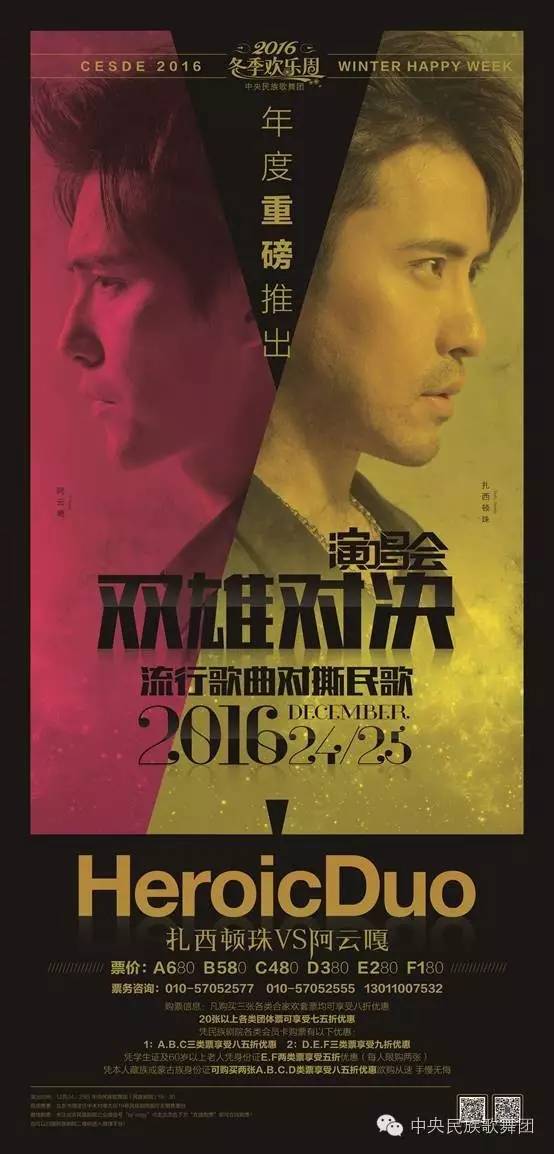 2016冬季歡樂周的重點演出無疑將是《雙雄對決——扎西頓珠VS阿云嘎》這臺獨特的音樂會,是一次音樂人之間的對話和握手,這場獨一無二的演出不容錯過。