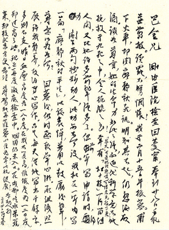 回蓉后,仍時感厥暈心跳。承組織照顧,許我靜養,故得專心寫作。只是每天僅能寫出千余字,多則不支。昨日血壓高度為一八〇度,在我不算高,惟低度為一二〇度,都過高了些?,F在再度澈底(徹底)檢查中。煙酒仍未入口。在成都吃水果蔬菜都較北京方便。希望尊駕能再蒞蓉小住為幸!此祝健康!