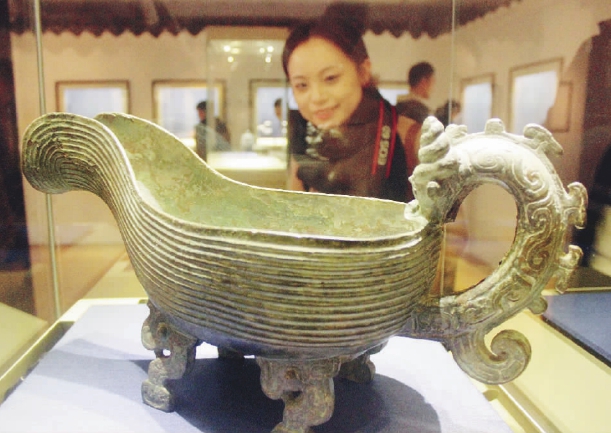 近日,“煙云四合——清代蘇州顧氏的收藏特展”在江蘇蘇州博物館展出。展覽展出故宮博物院、中國國家圖書館、上海博物館、南京博物院等國內9家文博機構的顧氏所藏書畫、古籍、碑帖、文房、青銅器等精品84件。內容涵蓋了宋、元、明、清的書法、繪畫、古籍、碑帖及文房用品、顧氏一門手跡等。圖為觀眾在特展上參觀“西周齊侯匜” 。