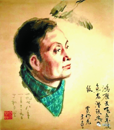 高莽畫賈作光像。作于1978年1月29日。賈作光在畫上題詩:“鴻雁長飛光不度,魚龍潛躍水成紋(文)”。