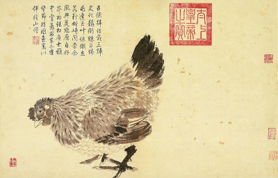 不過,明代畫家沈周筆下的雛雞恐怕就少了幾分農事意味,反而多了不少文人意趣。在他的《臥游圖冊》中,有一開僅僅描繪了一只雛雞。畫家用豐富的墨色層次,以簡約的造型表現出雛雞可愛的模樣,已經不似李迪那樣精細。沈周的雛雞似乎只為表現物像本身而作,并沒有太多別的想法。除了雛雞,沈周也描繪過家鄉的母雞。在這件作品中,畫家用墨更為考究,似乎著意通過墨色變化來反映母雞的毛色,用筆也更為簡率,頗有文人趣味。而文人畫家之所以能夠對雞入畫表示認同,不僅因為他們自己的興趣所致,更因為雞作為“德禽”獲得了他們價值觀上的認同。