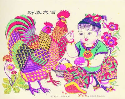 從現存的作品來看,描繪雞的歷史直到東漢末年都還是以神話主題為多。而這也構成了中國雞畫的一個文化基因——人們總是帶著對美好生活的憧憬或者是對神話世界的想象來描繪雞的。正如直到今天人們畫雞,還會取其諧音寓意“大吉大利”一般。在這種基因的作用下,雞越來越廣泛地出現在年畫、剪紙等多種不同的藝術語言之中,為人們送去吉祥與歡樂。